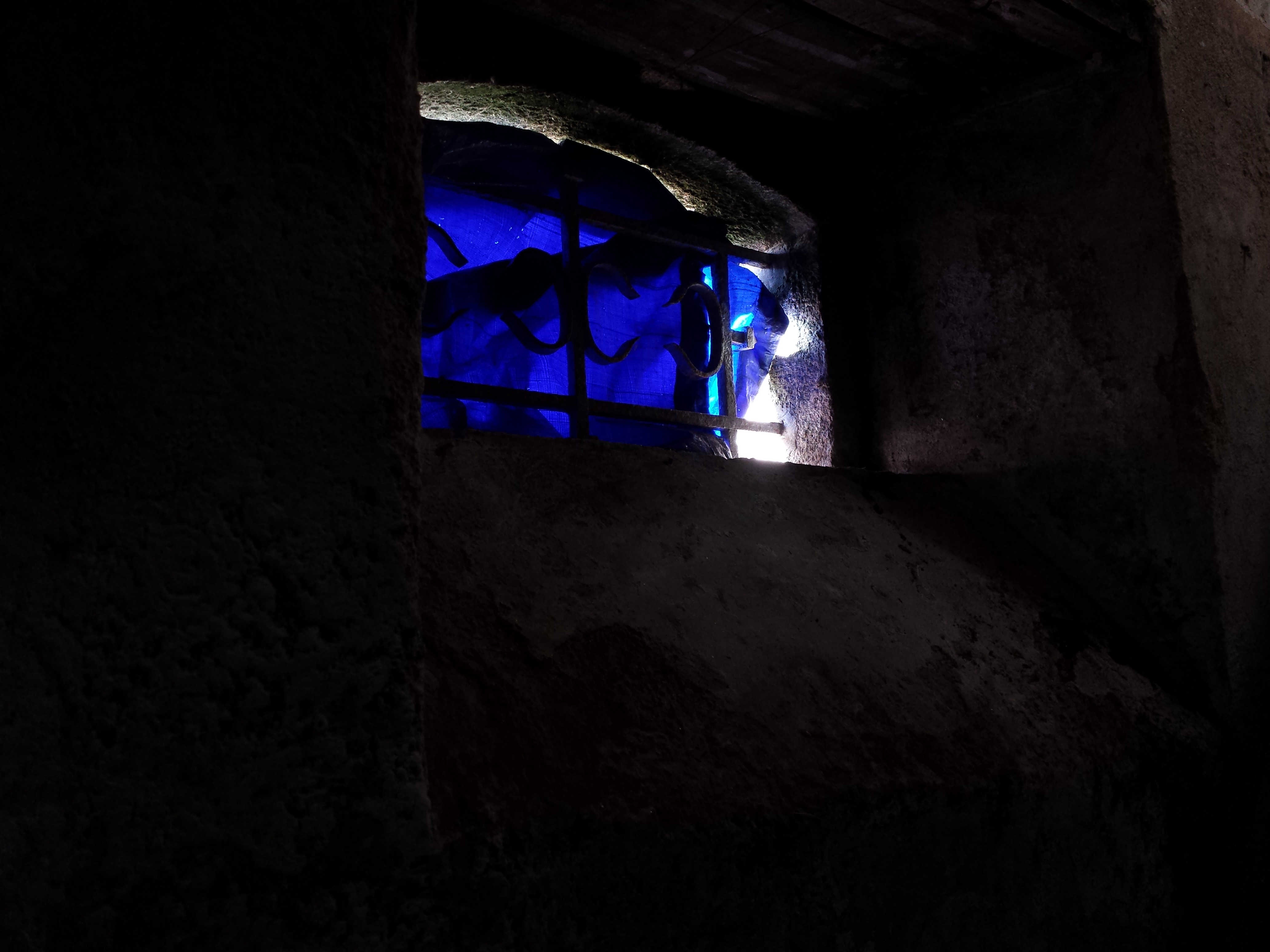 Aussi, j'ai pensé en voyant les soupiraux de la cave recouverts de cette bâche bleue que vous auriez pu la remplacer par un verre coloré de la même couleur (bleu outremer), peut-être seulement pour deux soupiraux sur quatre.