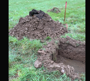 Les trous sont réalisés par Nicolas. On a récupéré du crottin de cheval chez la voisine de Jean-Yves. On fait un mix 50/50 terre naturelle + composte + 2 pelletés de crottin.
