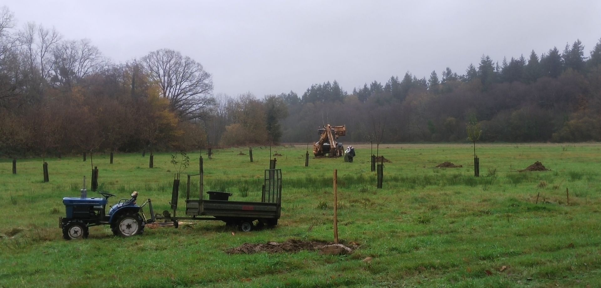 On se fait aider d'une pelleteuse pour les plantations, avec des trous d'environ 1m2 et 80 cm de profondeur.